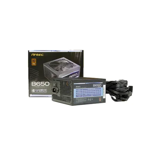 The brand new Antec ATOM B650 650W 80+ Bronze Power Supply is a power supply unit suitable for use in desktop computers. Antec ATOM B650 has a maximum power output of 650W and comes with a 120mm fan for cooling. The input voltage range is between 200VAC and 240VAC, with an input current of 6.3A and a frequency of 50Hz. The output power includes +3.3V, +5V, +12V, -12V, and +5Vsb connectors. ATOM B650 also features several connectors, including one 24-pin main connector, one 8(4+4)pin EPS12V connector, two 8(6+2)pin PCI-E connectors, five SATA connectors, and three Molex connectors. The Antec ATOM B650 650W Power Supply is rated as 80 PLUS Bronze, meaning it meets high efficiency standards set by the program. The DC output consists of +3.3V, +5V, +12V, -12V, and +5Vsb, also maximum current ratings of 18A, 16A, 42A, 0.3A, and 2.5A. The total combined power of the output is 110W, 300W, 3.6W, and 12.5W. Also, the total wattage of this power supply is 650W. Antec ATOM B650 650W 80+ Bronze Power Supply comes with 5 5-year warranty.