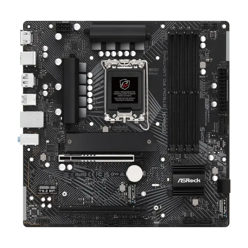 The ASRock B760M PG Lightning DDR5 Micro ATX Motherboard is a high-performance, feature-rich board that supports Intel's 12th, 13th, and 14th generation processors with the LGA 1700 socket. It is based on the Intel B760 chipset and provides an excellent blend of performance, connection, and cost. It supports the latest DDR5 memory at rates of up to 7200+ MHz (OC), resulting in faster data transfer and enhanced system responsiveness, making it perfect for gaming and multitasking. The motherboard includes a strong 10+1+1 power phase design, which ensures consistent power delivery for demanding CPUs. It has PCIe 5.0 x16 and PCIe 4.0 extension slots to accommodate current GPUs and storage devices, as well as dual M.2 slots for ultra-fast NVMe SSDs. The connectivity choices include 2.5G LAN, several USB 3.2 Gen2 connections, and high-quality Nahimic Audio for immersive sound. The board's sleek black PCB with silver accents creates a clean, modern design that is appropriate for any construction. Additionally, ASRock's Polychrome RGB provides programmable lighting to improve visual attractiveness. With dependable build quality, efficient cooling features, and broad compatibility, the ASRock B760M PG Lightning DDR5 is a wonderful choice for gamers and creators looking for a compact yet powerful motherboard for their next-generation Intel setup. ASRock B760M PG Lightning DDR5 Micro ATX Motherboard comes with 3 Years Warranty.