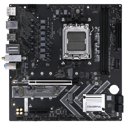 The Colorful BATTLE-AX B850M-E WIFI V14 is a compact yet capable Micro-ATX motherboard built around the AMD B850 chipset and designed for the AM5 socket. It supports the latest AMD Ryzen 7000, 8000, and even 9000-series processors, making it future-ready for high-performance builds. Memory-wise, it offers two DDR5 DIMM slots, supports up to 96 GB total (48 GB per slot), and overclocks up to DDR5-7600 (OC). Storage and expansion are well catered for with dual M.2 slots — one supporting blazing PCIe 5.0 x4, the other PCIe 4.0 x4 — alongside a full-length PCIe 4.0 x16 for a GPU. On the connectivity front, it includes integrated WiFi 6 and Bluetooth 5.2 via an Intel AX200 module, plus a Realtek Gigabit LAN chip for wired networking. A great value board for budget-conscious builders who want AM5 support and modern features in a Micro-ATX form factor.