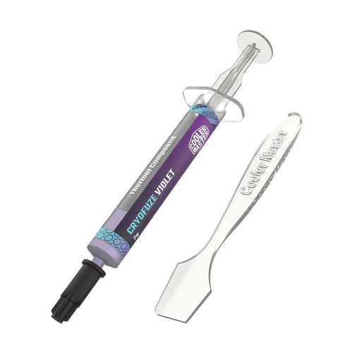 The new Cooler Master CryoFuze Violet Tinted Thermal Paste is a high-performance thermal compound designed to ensure optimal heat transfer between your CPU and cooler. With a thermal conductivity of 12.6 W/m.K, this thermal grease ensures efficient heat dissipation, keeping your system running cool even under heavy loads. The specific gravity of 3.0 at 25°C ensures that the grease remains stable and effective over a wide range of temperatures. The product comes in a 0.7ml volume, providing ample amount for multiple applications. The package includes a scraper for easy and precise application, and a grease cleaner for maintaining cleanliness and performance over time. The Cooler Master CryoFuze Violet Purple Thermal Grease is part of the Thermal Grease series, known for their superior cooling performance. Experience the difference in cooling with the Cooler Master CryoFuze Violet Purple Thermal Grease. Cooler Master CryoFuze Violet Tinted Thermal Paste has no warranty.