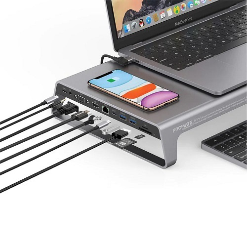 The Promate PowerDesk 11-in-1 Anti-Skid Aluminum DeskHub Stand Convert your laptop into the ultimate working station using the USB-C multi-function laptop stand. PowerDesk boasts a powerful 10W Qi wireless charging pad with 87W USB-C Power Delivery. The laptop charging stand also features VGA and 4K HDMI ports, so that you can connect a monitor, TV, or projector with ease. The RJ45 connector allows you to connect to the internet. Besides, the two USB 3.0 ports are available for data transmission. The wireless charging laptop stand has a sleek design. You can use PowerDesk with all USB-C-powered laptops. The Promate PowerDesk 11-in-1 Anti-Skid Aluminum DeskHub Stand has a 2-year Warranty.